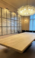 This dining table combines a solid travertine top with a burl wood base, offering a clean, natural look with a touch of character. The light stone surface pairs well with the rich wood grain, creating a warm, balanced design. Functional and stylish, it works well in both modern and classic spaces.